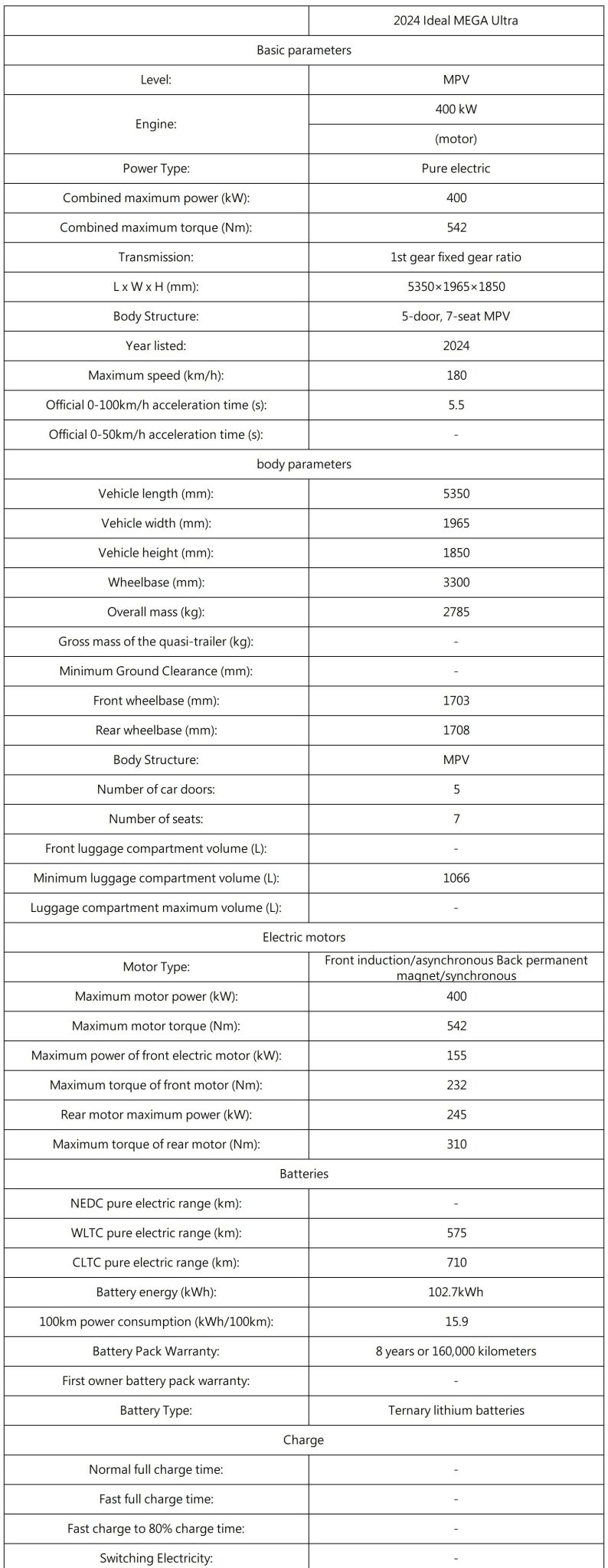 Powertrain & Performance The Li Auto MEGA delivers powerful and efficient electric performance, featuring: